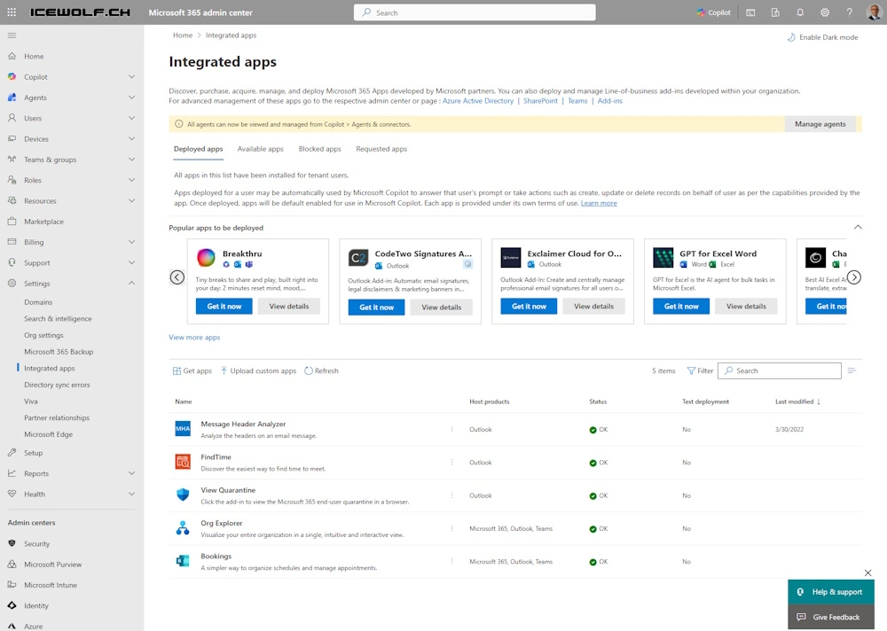 I’ve checked the M365 Admin Center > Settings > Integrated Apps
