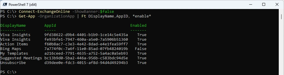 Get-App -OrganizationApp | ft DisplayName, AppId, *enable*