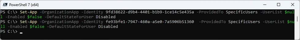 Set-App -OrganizationApp -Identity 9fd38622-d9b4-4401-b1b9-1ce14c5e435a -ProvidedTo SpecificUsers -UserList $null -Enabled $false -DefaultStateForUser Disabled