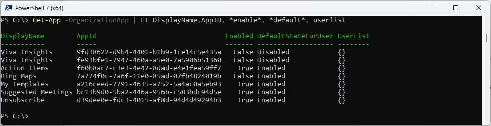 Get-App -OrganizationApp | Ft DisplayName,AppID, *enable*, *default*, userlist