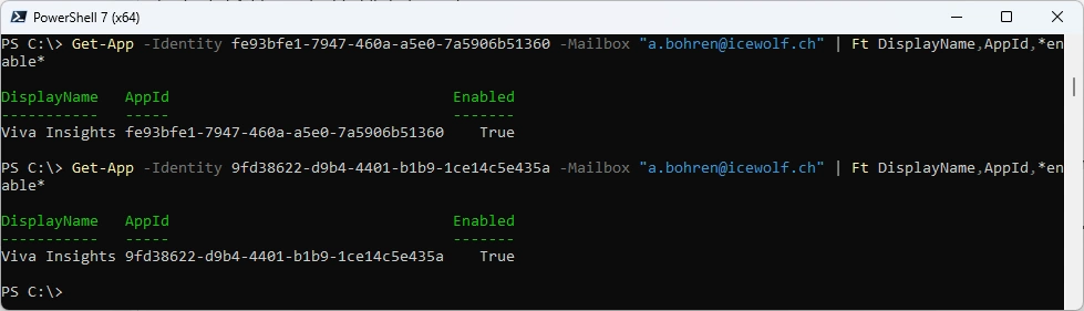 Get-App -Identity 9fd38622-d9b4-4401-b1b9-1ce14c5e435a -Mailbox "a.bohren@icewolf.ch" | Ft DisplayName,AppId,*enable*
